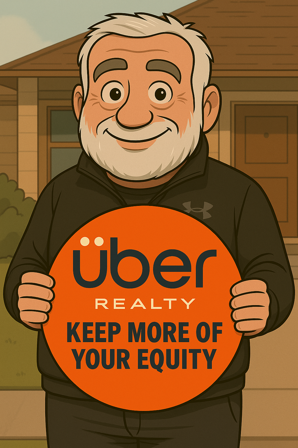 Earl and Marlene, acouple dressed in camouflage, are crouched behind bushes outside their suburban home, observing a frustrated potential buyer leaving. The buyer mutters about the "vintage Airbnb-ready" attic being full of raccoons. A "For Sale by Owner" sign is humorously altered with duct tape, revealing a new sign underneath: “Call Uber Realty—We’re Not That Crazy Anymore.”